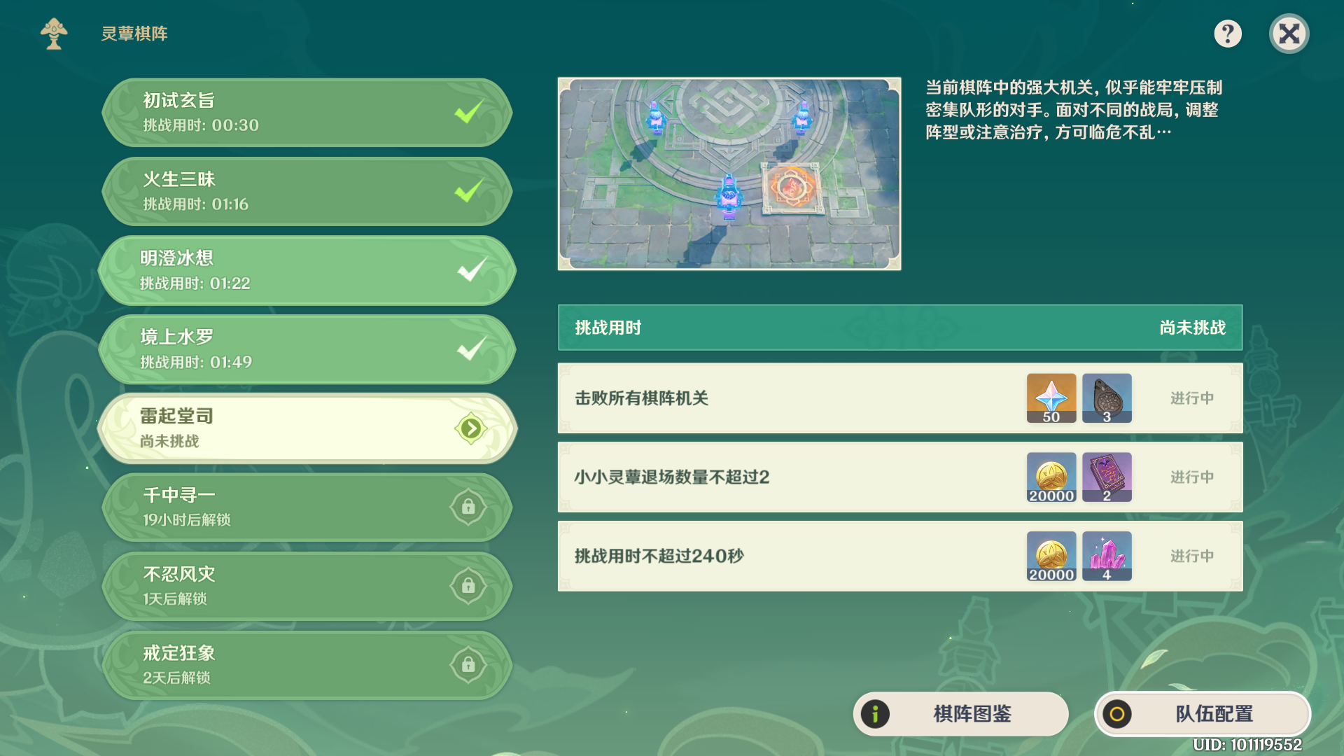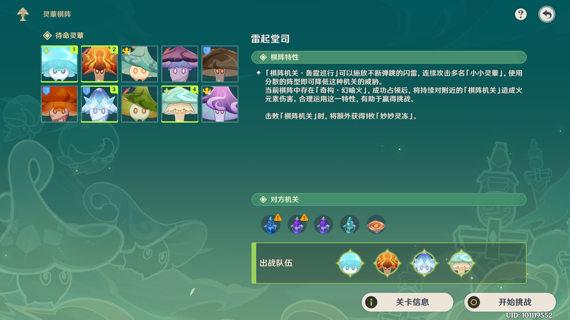 关卡打法:对面也有高额爆发,治疗很重要(不要残血在治疗),多用火蕈兽,和冰蕈兽的技能攻击(技能攻击时尽量打倒更多目标)场上出现【喝彩加护】时点击蕈兽前往拾取,其中【棋阵·镜水明利】会为其周围的【棋阵机关】生成护盾,优先攻击