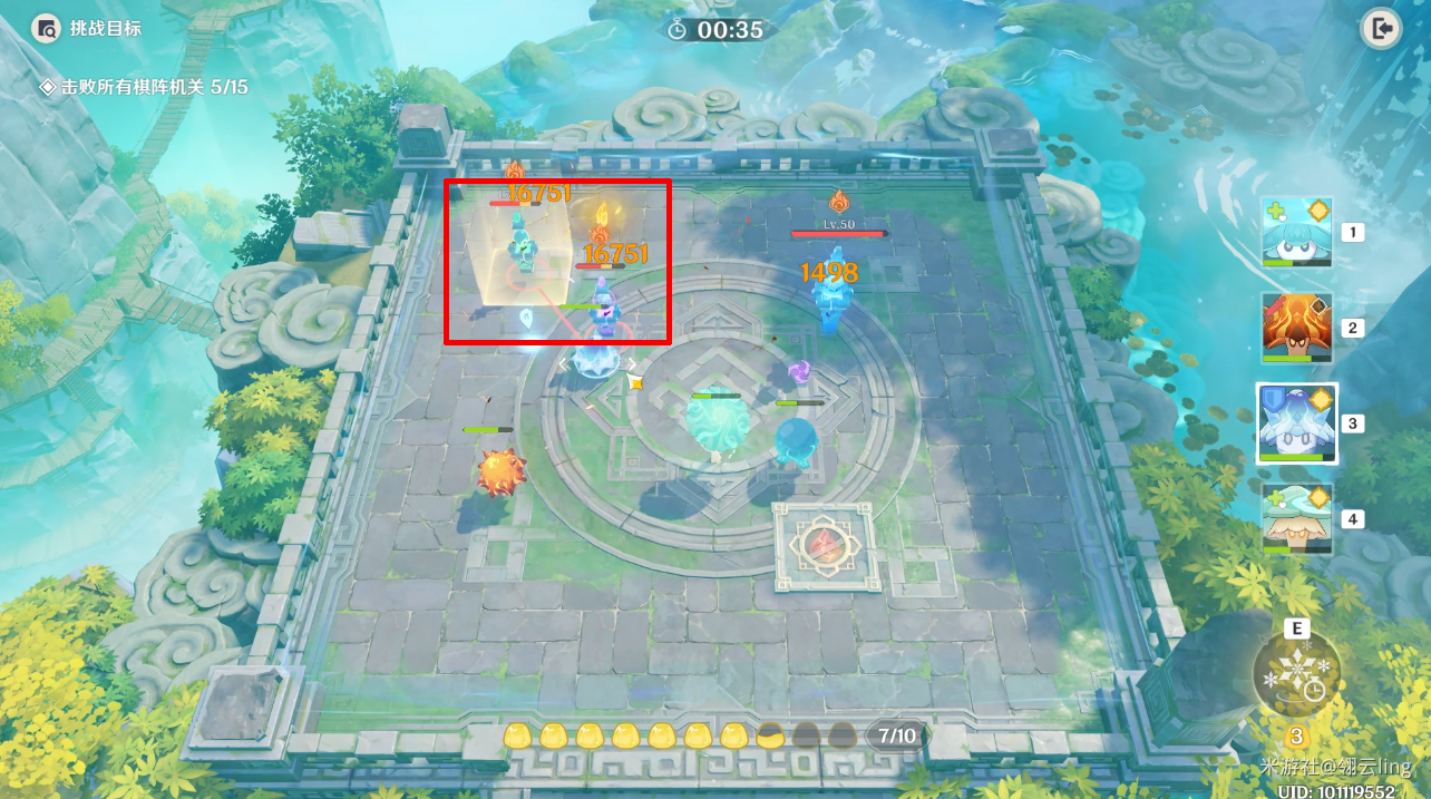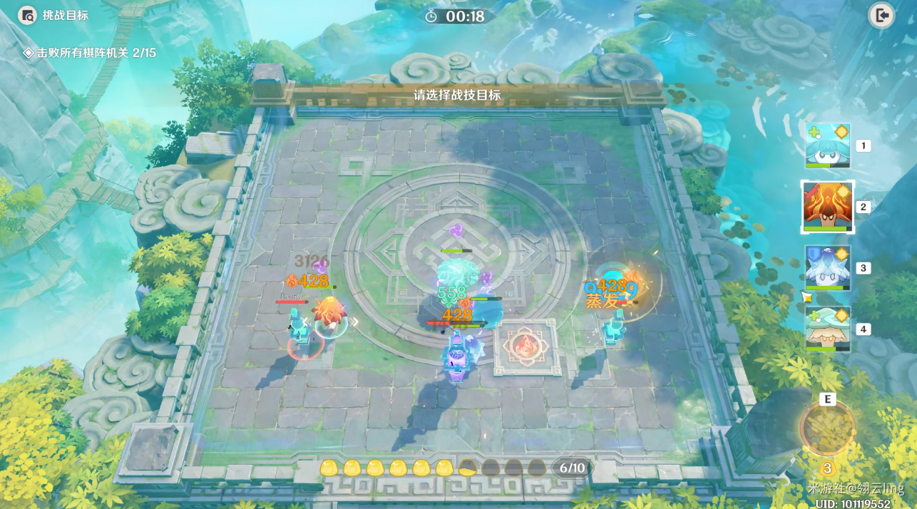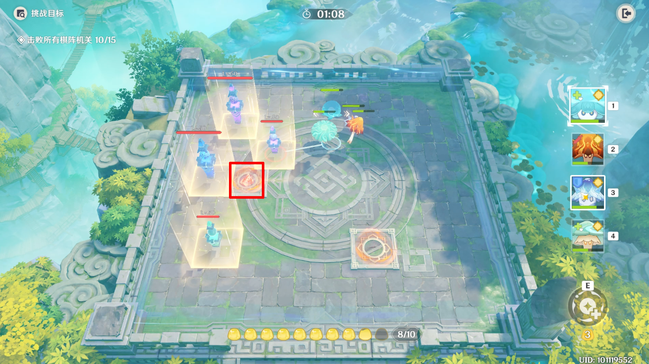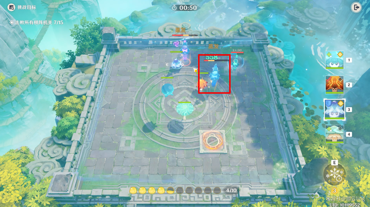 2.第二波,冰蕈兽站住【棋阵·幻喻火】开技能,打右侧两个【棋阵机关】,击败后,集火左侧【棋阵机关】